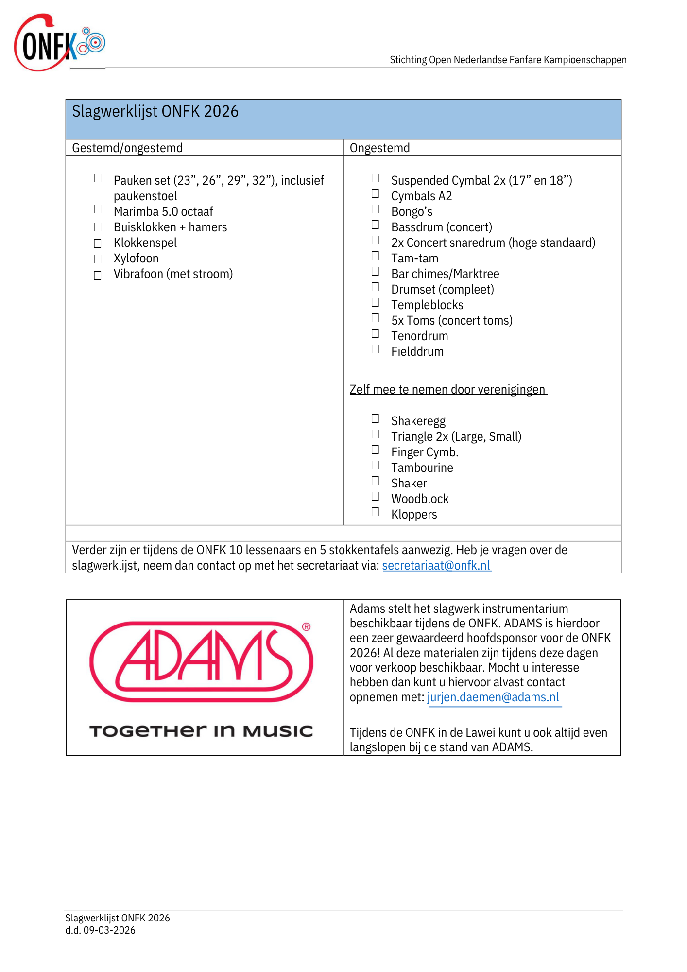 2026 Livestream en online programmaboek Nieuwe muzikanten op het ONFK-podium Deelnemers ONFK 2026 Juryleden ONFK 2026 Dagindeling ONFK 2026 Kaartverkoop ONFK 2026 Slagwerklijst ONFK 2026 Verplichte werken 2026 Laatste nieuws Sponsoren 2026 2.0 Organisatie Bestuur Contact Reglement Privacy Statement Meerjarenplanning ONFK Stichting Open Nederlandse Fanfare Kampioenschappen Sponsoren
